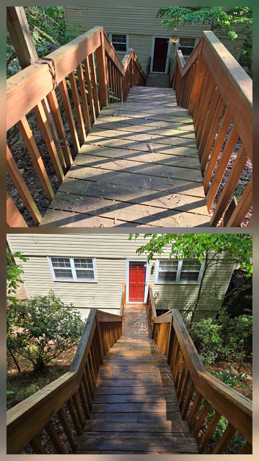 The decks needed two applications of our soft wash solution, along with low-pressure washing, to effectively eliminate the organic growth present on and beneath the surfaces. High-pressure washing can damage the wood fibers and push organic matter deeper into the wood, which will cause the algae and mold to reappear in the future. Soft washing is the safe and effective way to eliminate organ growth and prevent damage to the wood fibers.