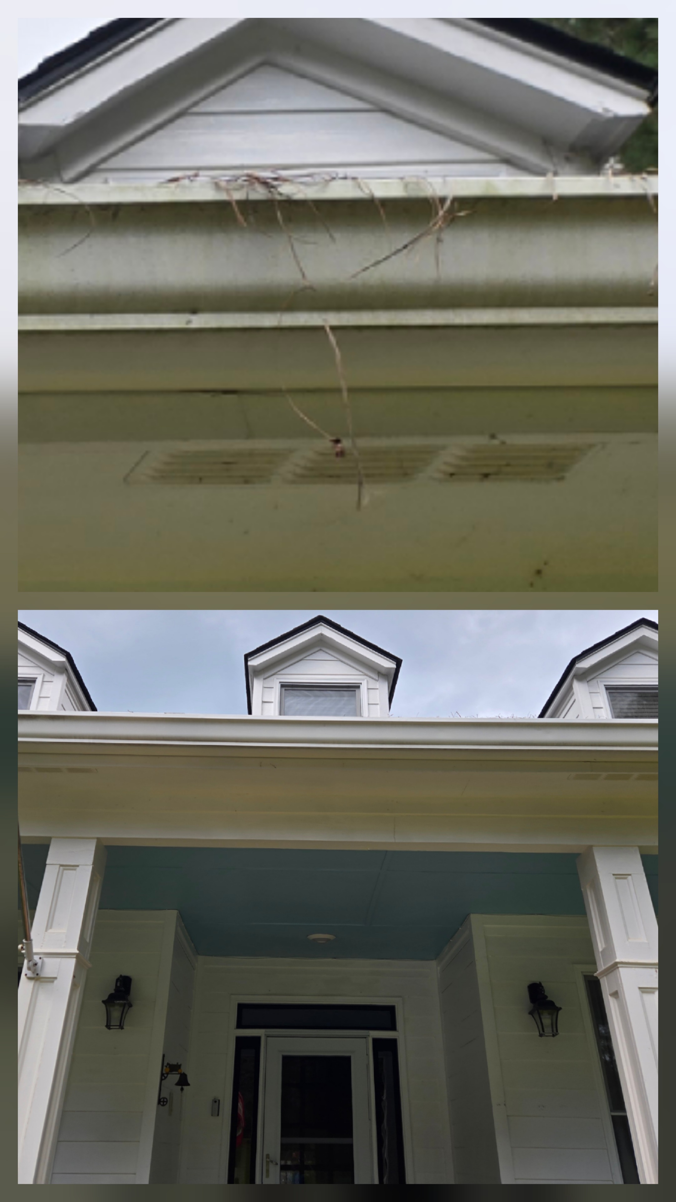 The algae and mold were eliminated using the soft washing method. This technique effectively kills and gently removes organic growth, significantly prolonging the cleanliness of the surfaces. The tiger striping on the gutters was removed using a specially formulated cleaner designed to eliminate these streaks. Even though the red clay stains were severe, most of them were successfully removed.